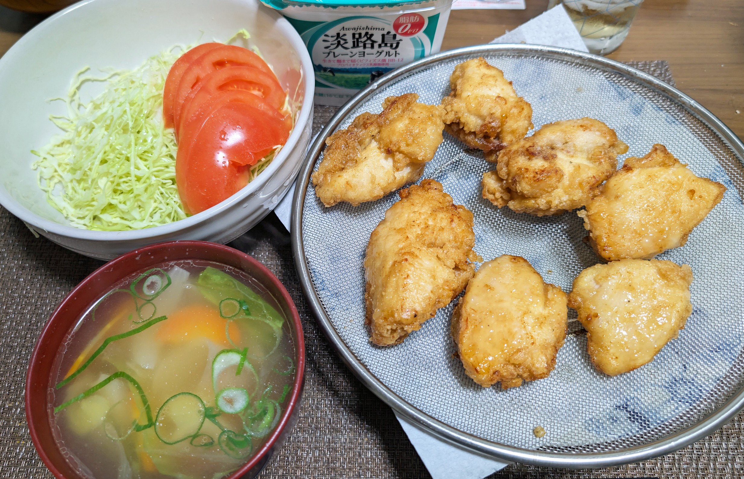 【鶏むね肉の唐揚げと中華スープ】【野菜盛りそば】【湿布買ったりなど】