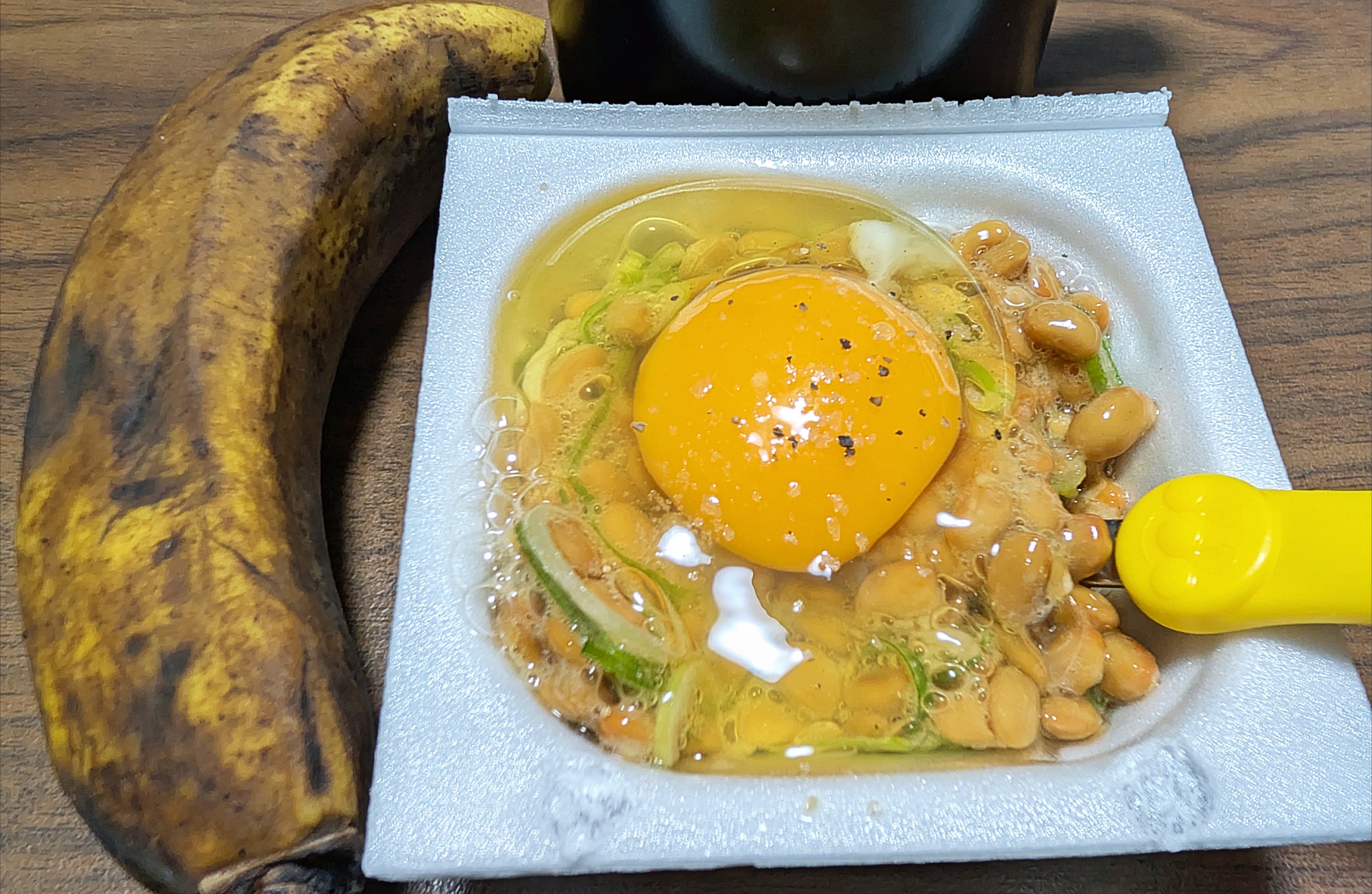 朝は、バナナ卵納豆with黒塩胡椒