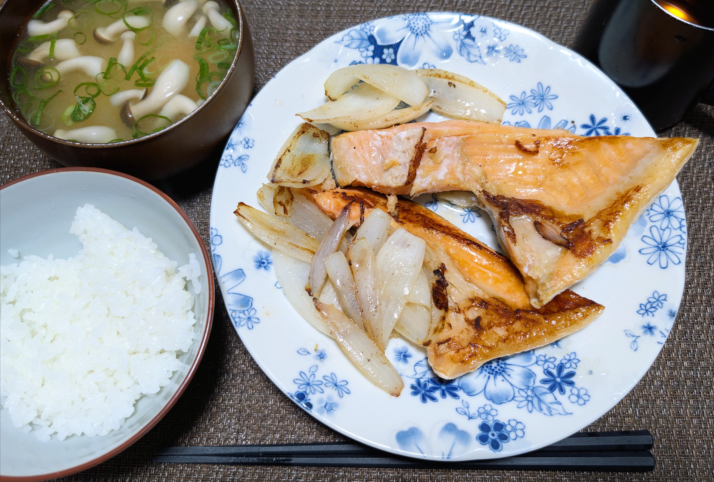 いつも通り、まずは水>昆布つゆ>酒で茹でてから、水気を取って(一部を味噌汁にいれて)、オリーブ油で焼く。米は息子がついでくれた。