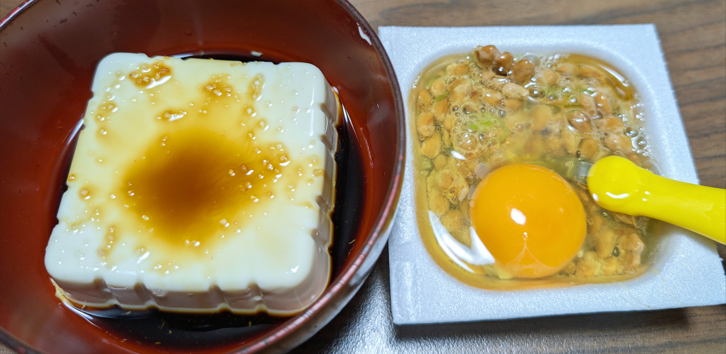 朝は、卵納豆と醤油豆腐