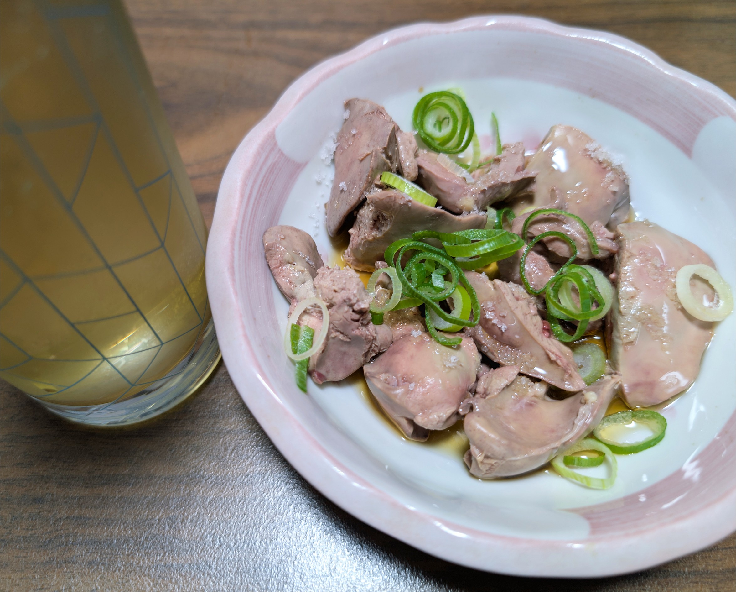 晩酌は、熱湯に35分ほど漬けた鶏肝に、ごま油と塩と葱をかけたやつをハイボールで😋