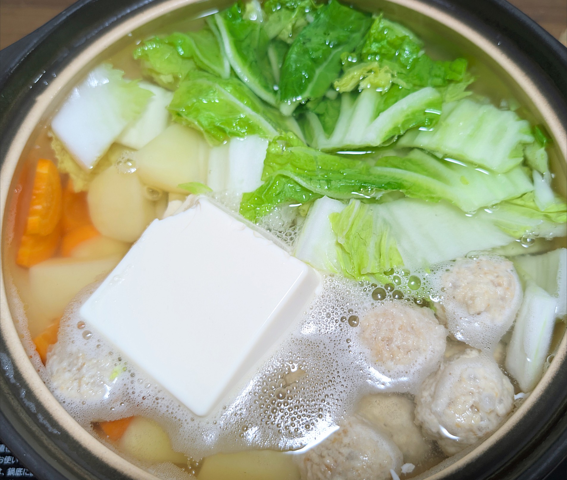 水>白だしで、白菜・人参・じゃがいも・肉団子・豆腐を茹でる。