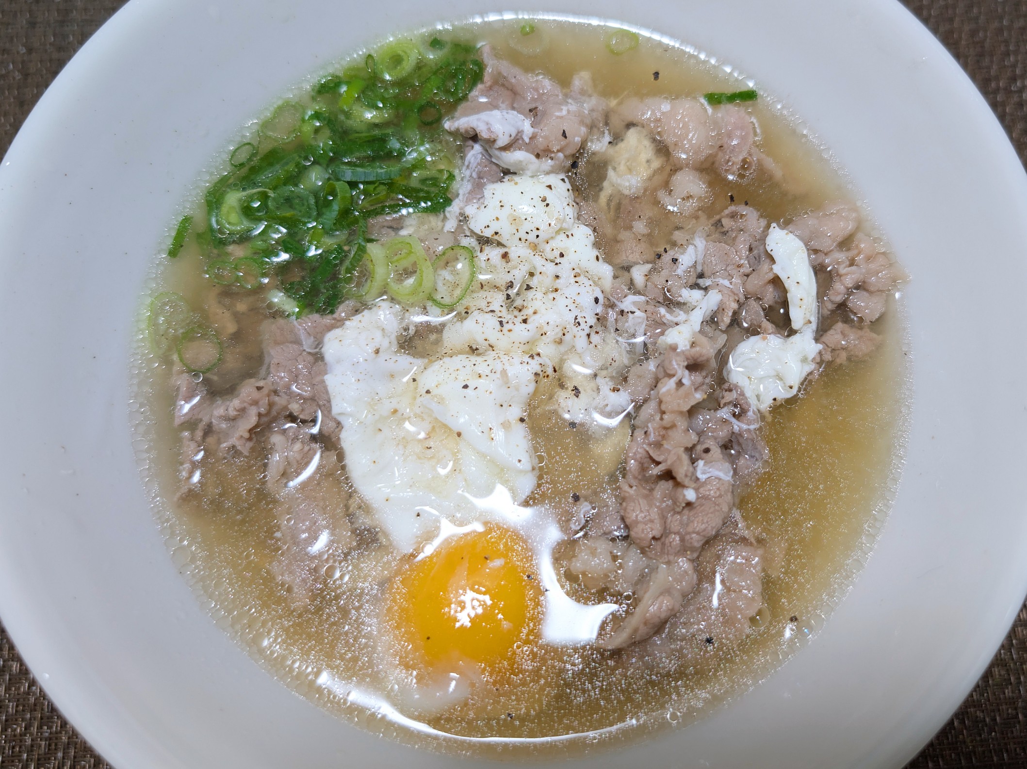 水>濃口醤油>みりん>酒>白だし>鰹・いりこ出汁を沸騰後、牛コマ肉を炊く。あくを取ってから卵を入れて、レンチンうどんを入れる。