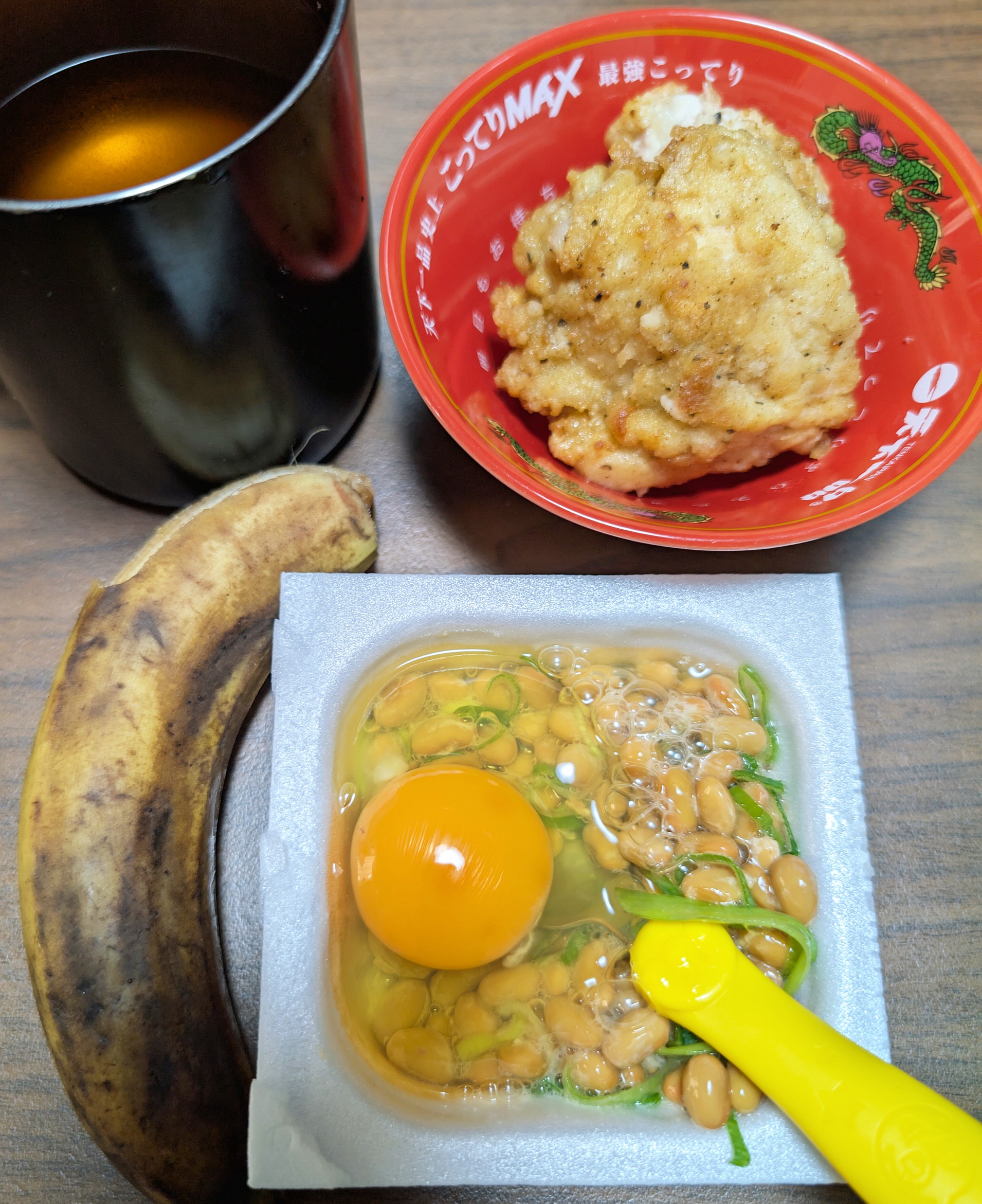 朝は、昨日の残りフライドチキンとバナナ卵納豆