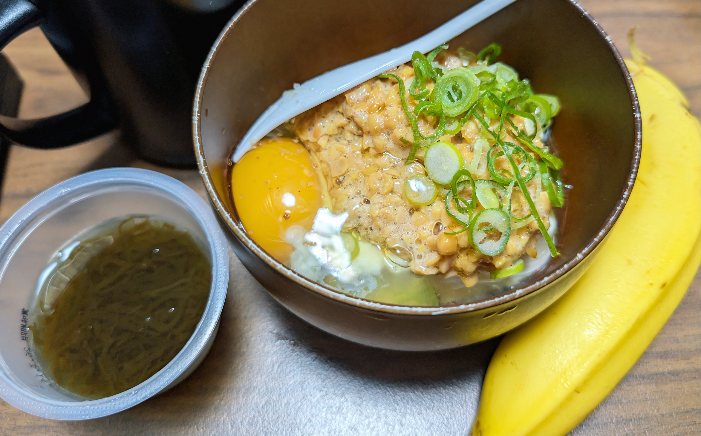 昼は、卵もずく酢ひきわり納豆腐バナナ