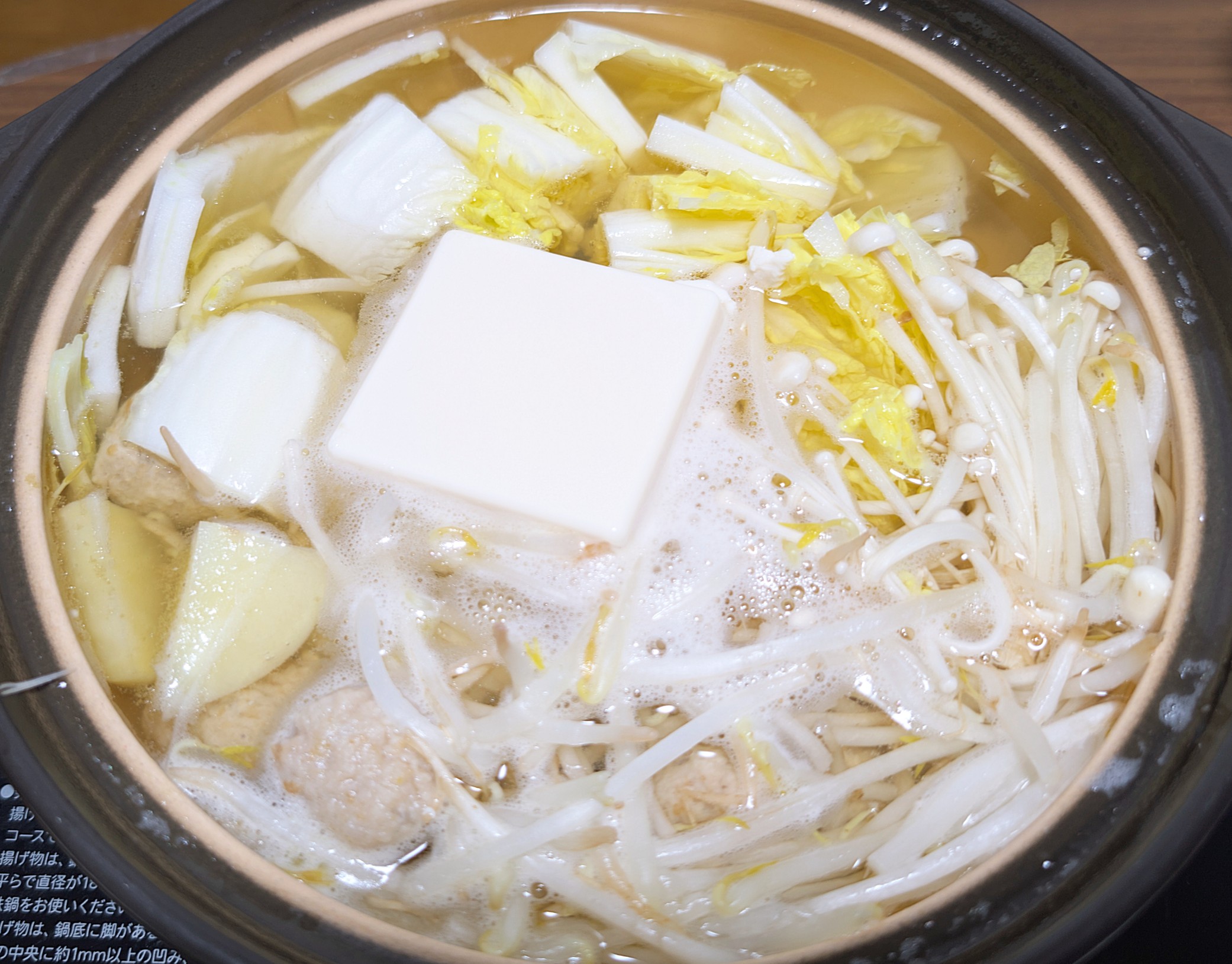 水>薄口醤油>みりん>昆布出汁で白菜・えのき・じゃがいも・もやし・肉団子・豆腐を沸騰させる。