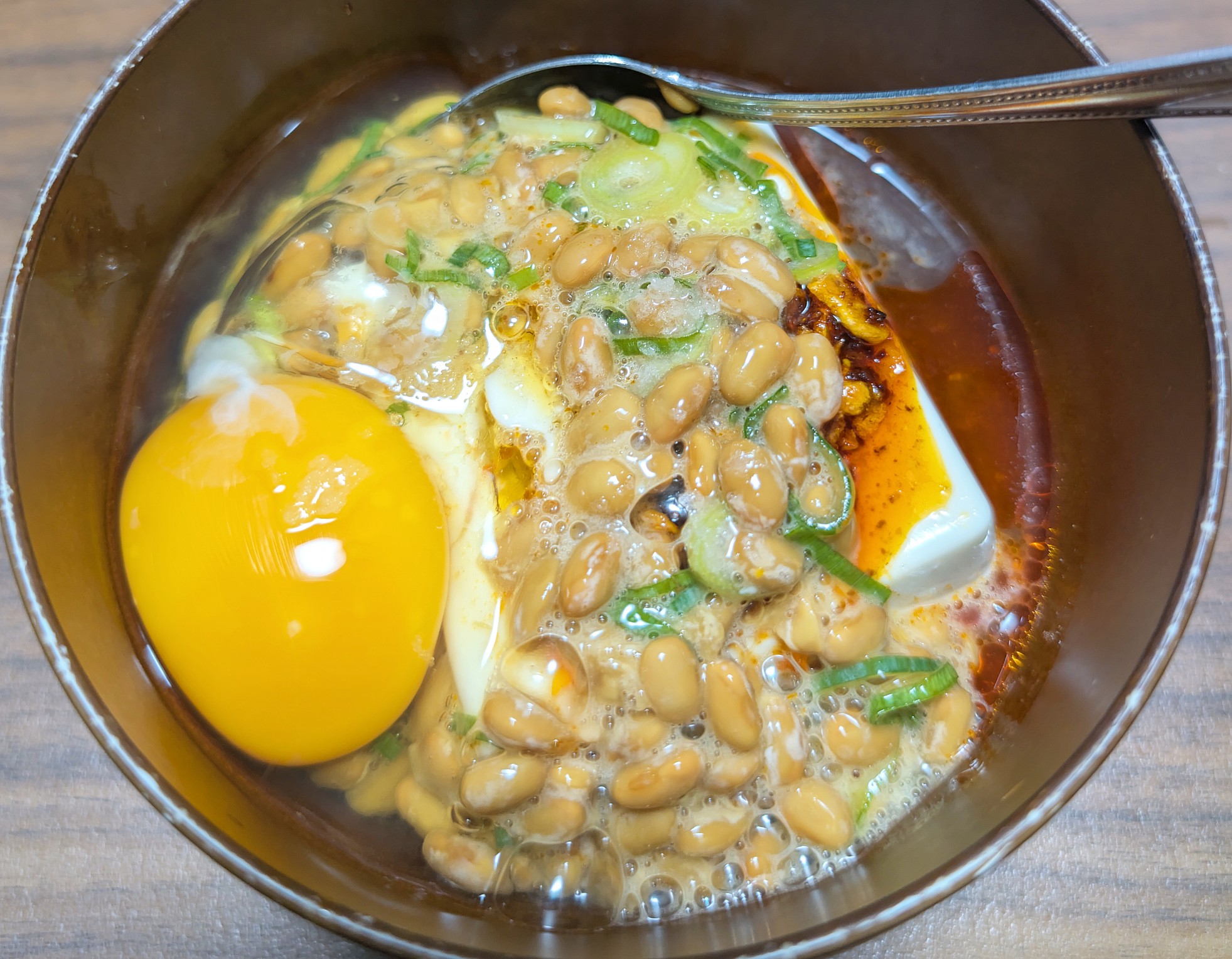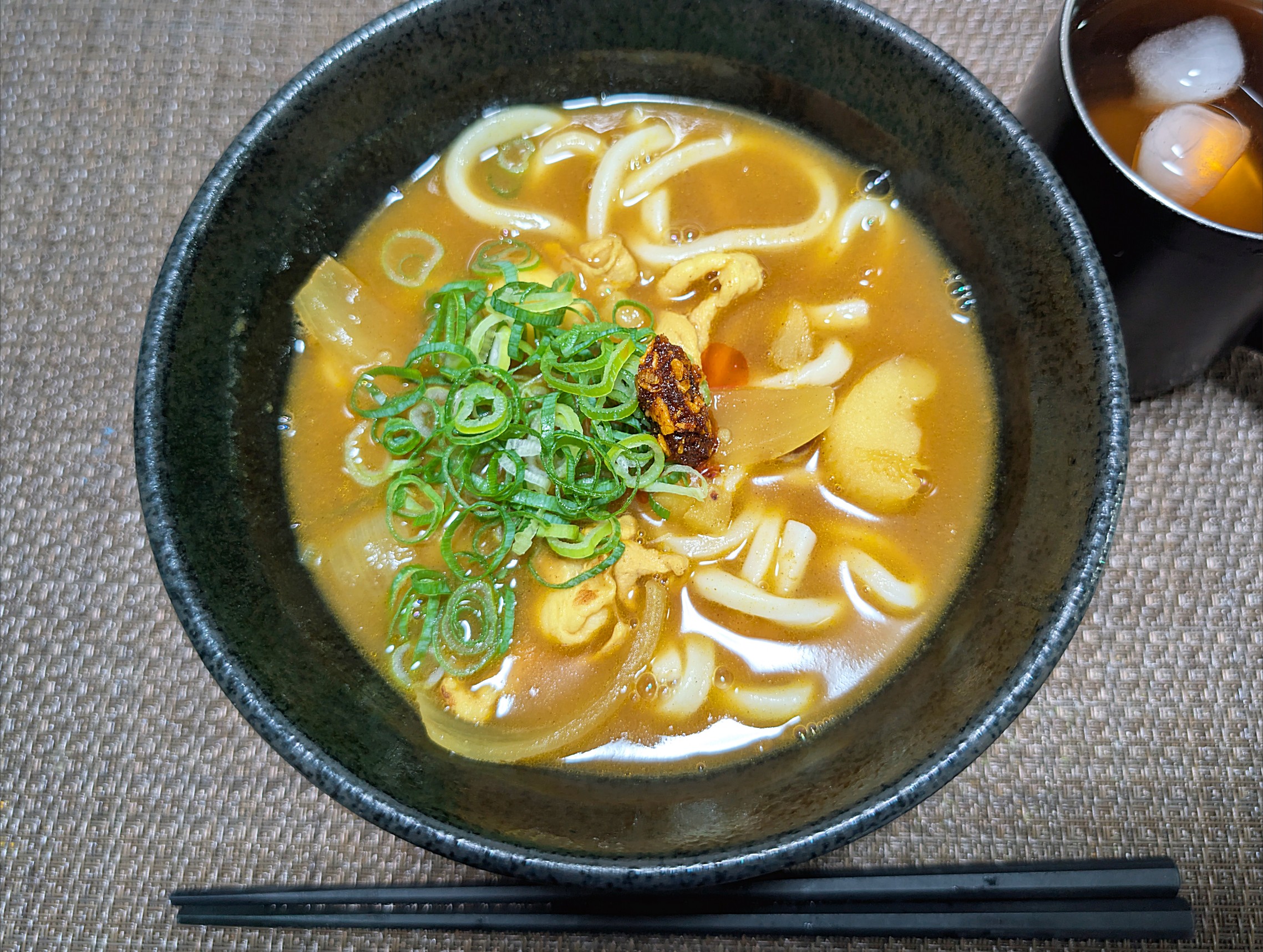 水>白だし>いりこを炊いて、残りカレーを加えて混ぜる。レンチンうどん・食べラー・葱を入れたら完成❗️