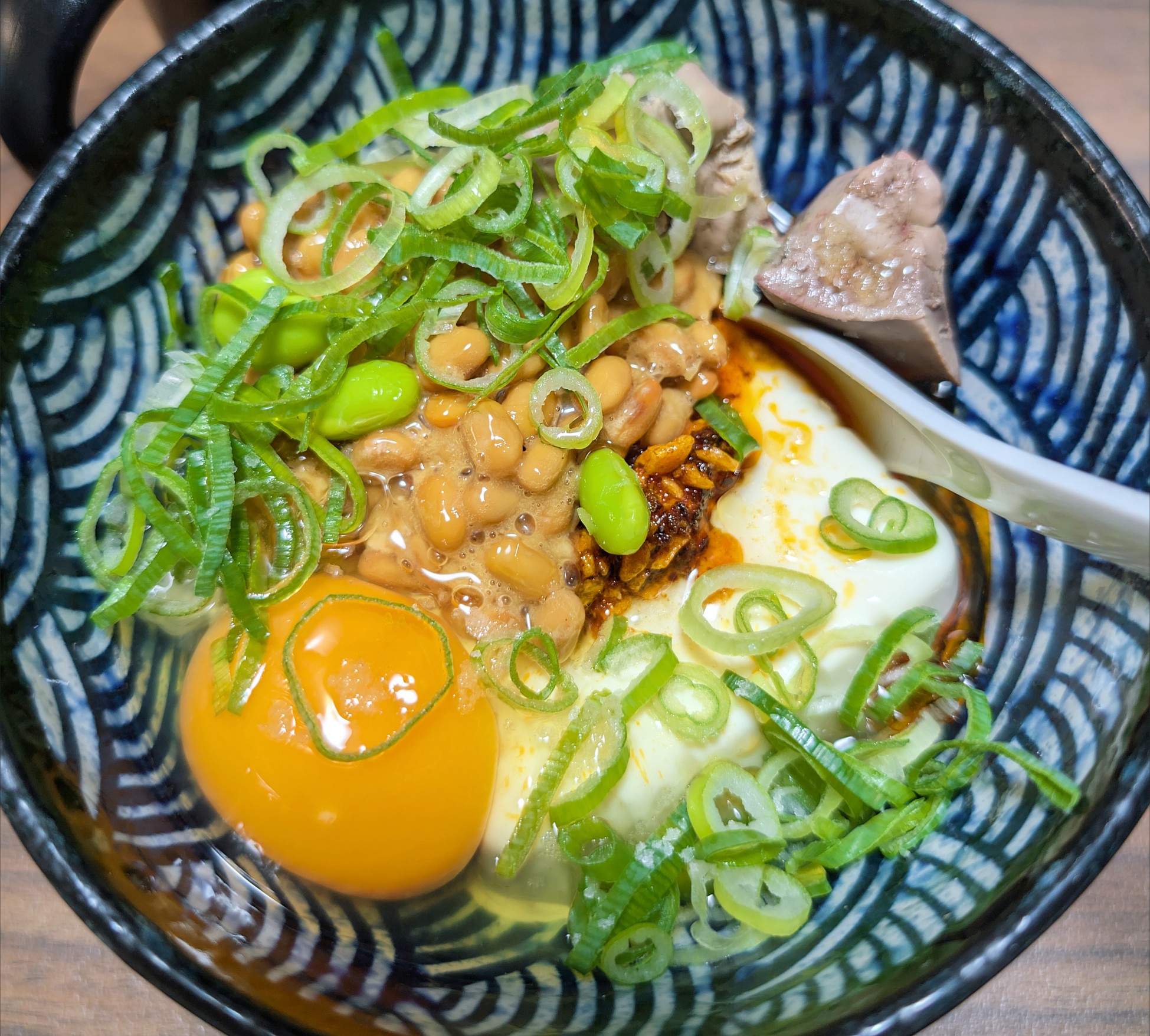 濃口醤油:大1>酒:大1>味噌:大1>ザラメ:大1/2を加えて絡めてから、中華スープ(味覇>オイスター>ごま油):200ml・湯煎した豆腐・小松菜を入れる。