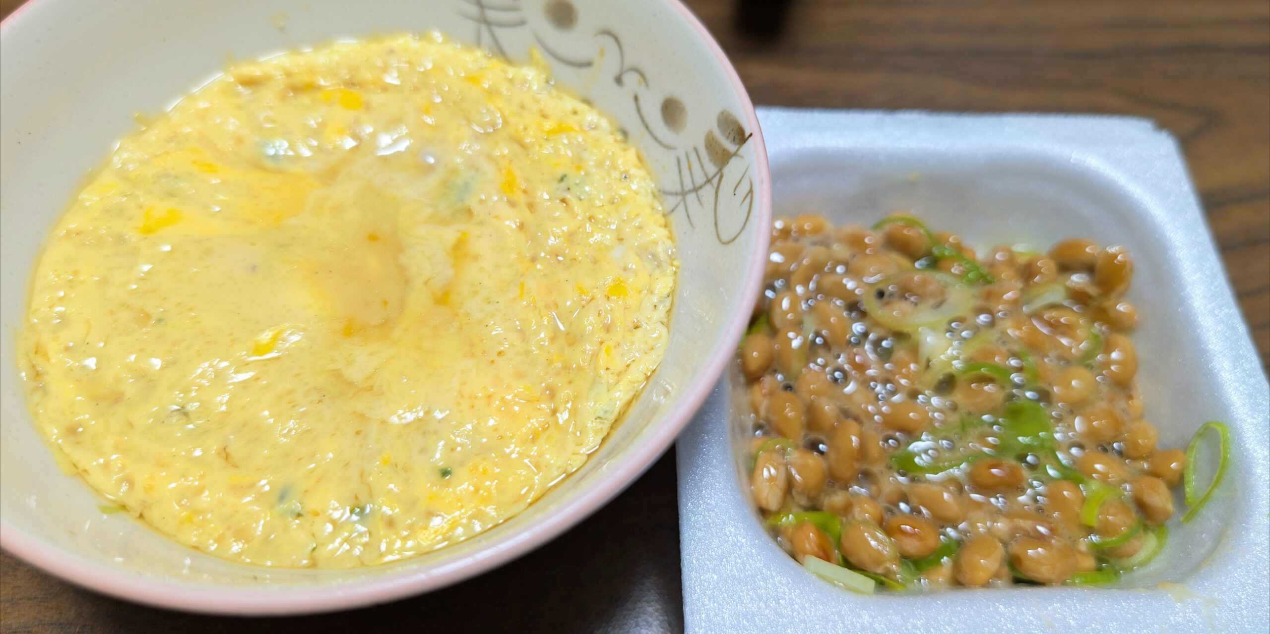 朝昼は、カップ麺と茶碗蒸しと納豆