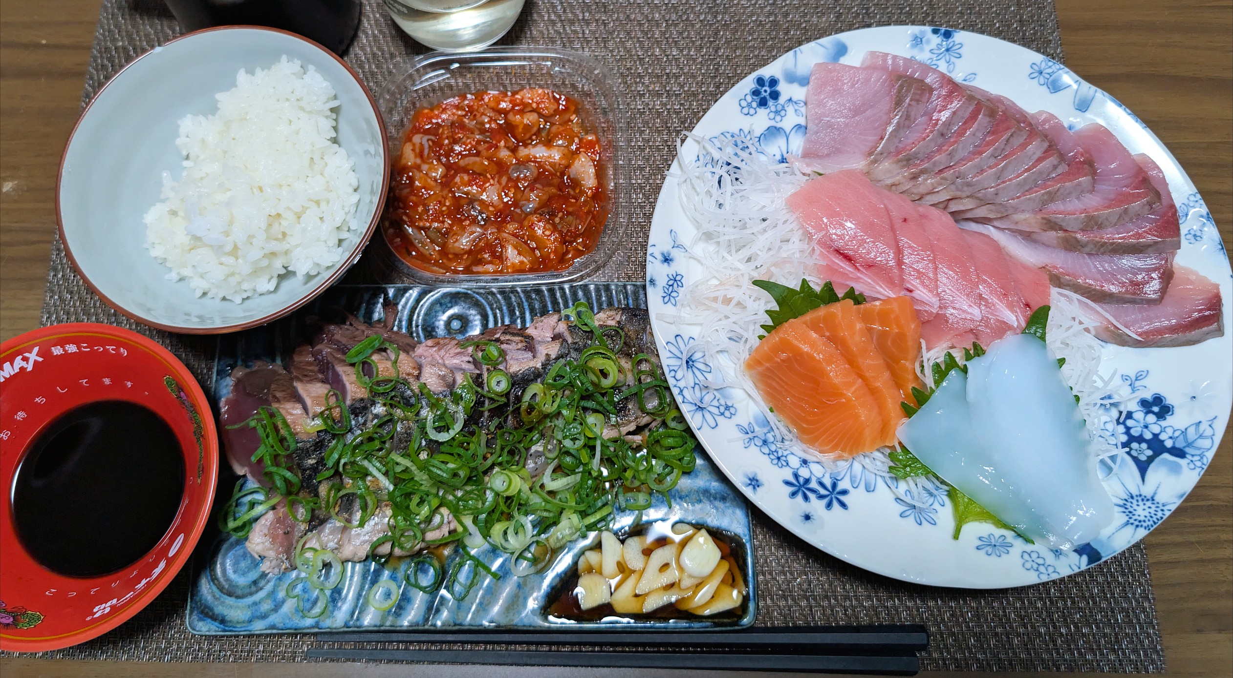 今夜は、鰹のタタキ・鶏肝の煮付け他