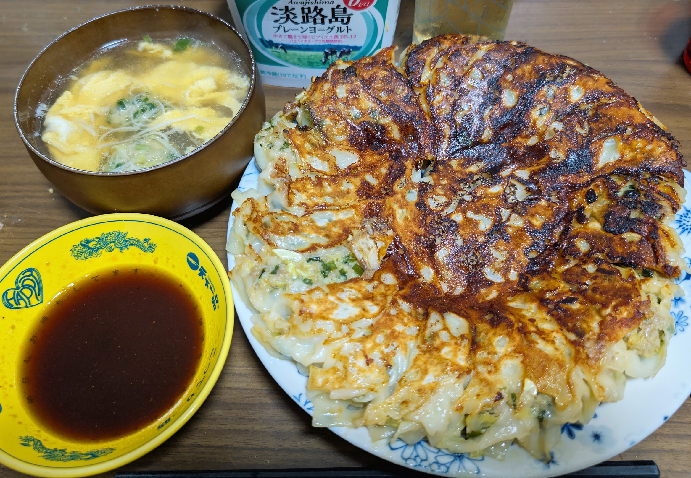 夕食は昼の麻婆のあまりの豚ミンチを使って、放置してたニラ使って餃子。妻が皮包みをヘルプしてくれた。