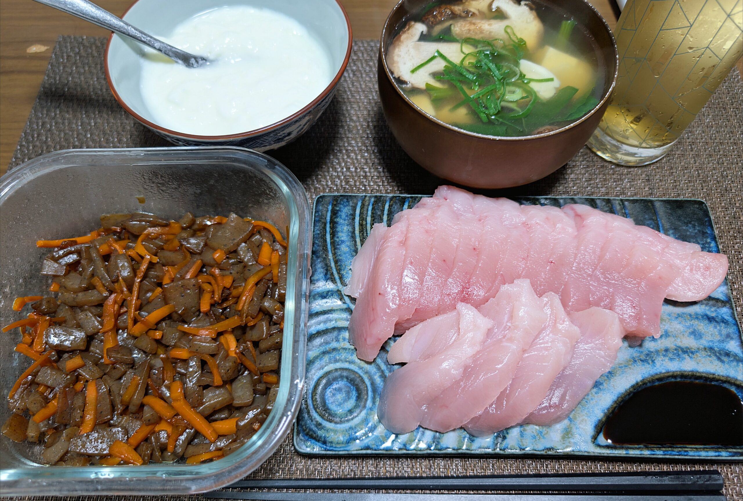 【蒟蒻と人参のきんぴらとビントロ刺身】【月曜日まったり散歩】