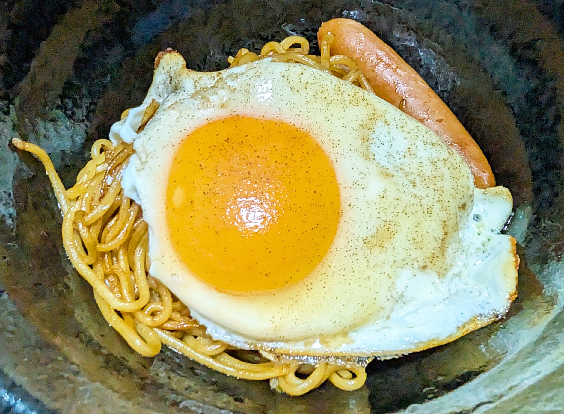 【目玉焼き乗せ焼きそば】【焼き塩鮭と味噌汁】【ゲオ散歩】